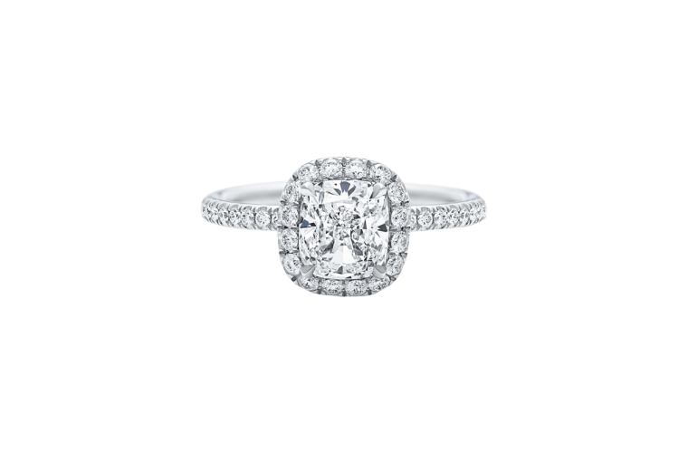 ومن علامة هاري ونستون Harry Winston، اخترنا لك خاتم بلاتين رفيع مرصع بالألماس الأبيض مع حجر بقصة Cushion في الوسط.