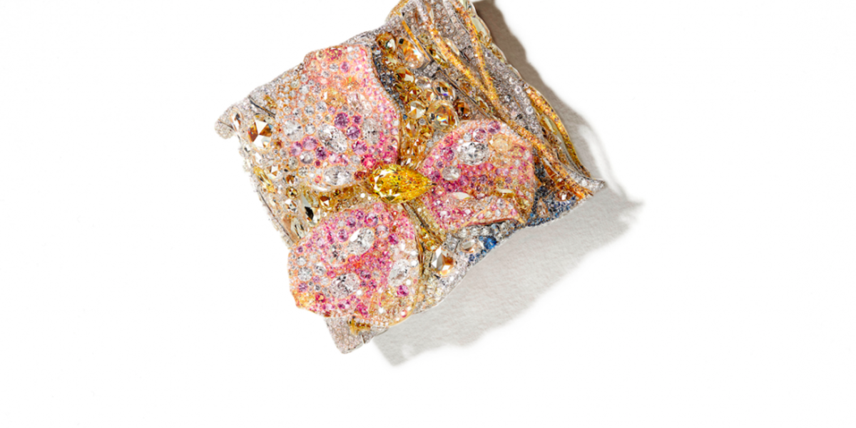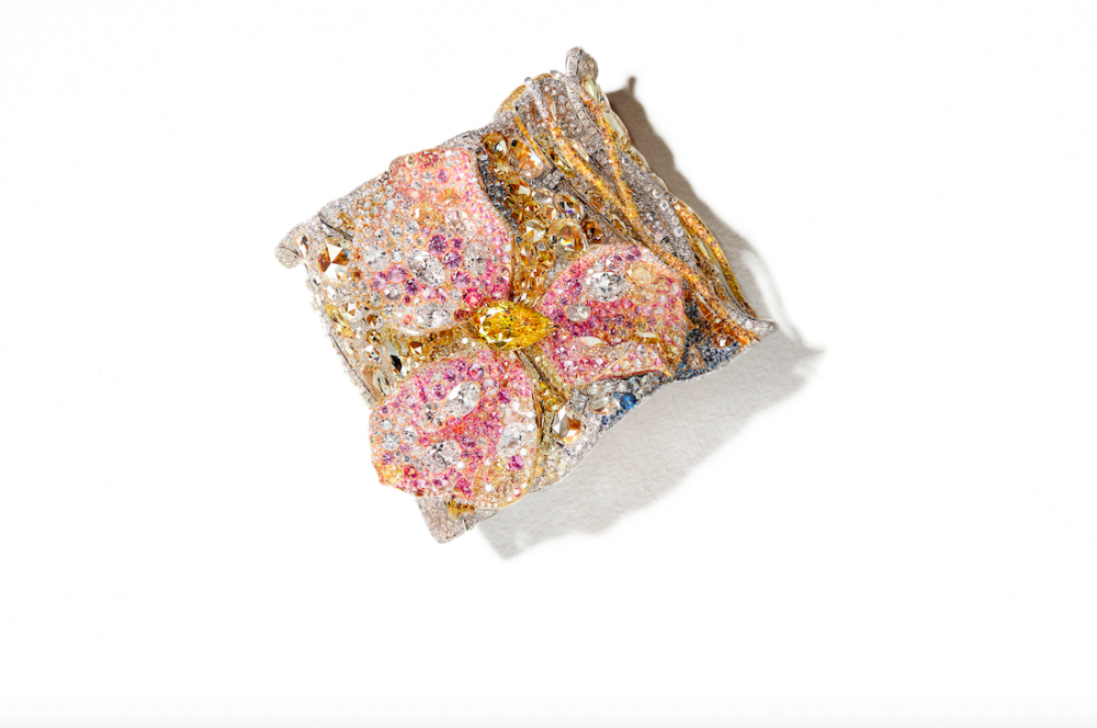 من علامة سيندي تشاو نختار اسوارة Iris Sculptural Bangle  المتألقة بإبداع خالد يحاكي سحر الألوان فالطبيعة والزهور كاللوحة الفنية المنسوجة من الذهب الأبيض والأصفر والماس الأبيض والأصفر والبني والياقوت الوردي والأزرق والبرتقالي.