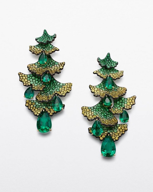 من علامة شوبارد نختار أقراط 2020 Red Carpet Collection بتصميم نابض بسحر الطبيعة مستلهم من عشبة نبات الجينكو في أناقة الذهب والتيتانيوم مع الزمرد والتسافوريت والياقوت الأصفر.