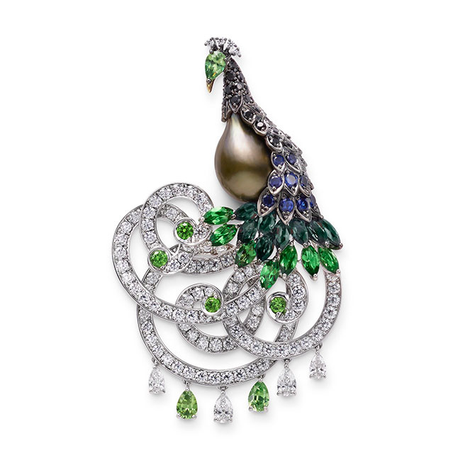 من علامة ميكيموتو نختار بروش متألق بالفخامة في تصميم الطاووس بإنسيابية وأنوثة من الذهب الأبيض والماس واللؤلؤ الأسود والياقوت الازرق والألكسندريت والغارنيت والاسبنل.