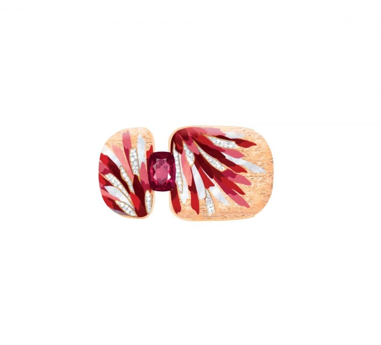من علامة بياجيه نختار خاتم من مجموعة Wings Of Light بإستلهام ساحر من أجنحة الطيور وريشاتها الملونة في فخامة الذهب الوردي والماس مع أناقة الماركتريه بالأخشاب وعرق اللؤلؤ.