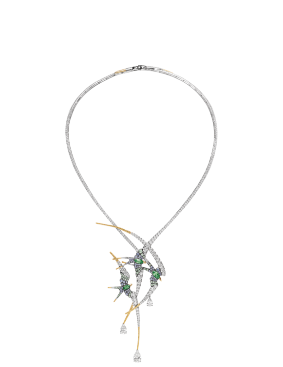 من علامة شوميه نختار قلادة من مجموعة Les Ciels des Chaumet بتصميم خلاب وشاعري لتشابك الطيور المحلقة في أناقة الذهب الأبيض والاصفر والماس والياقوت الأخضر والأصفر والغارنيت.