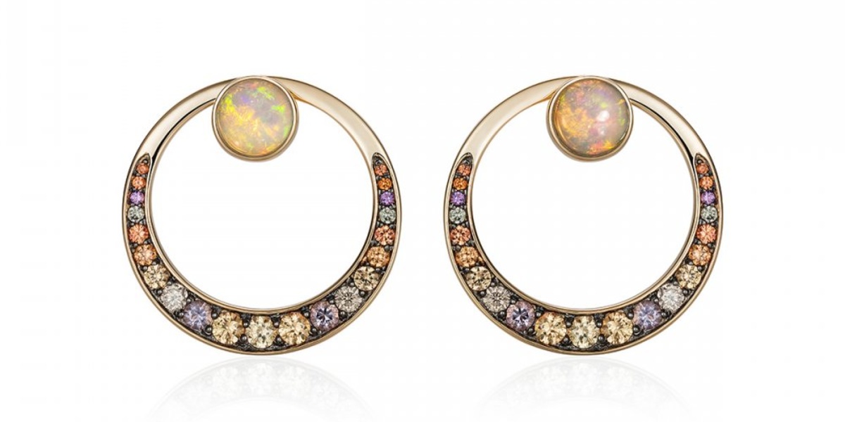 ومن علامة نور فارس Noor Fares، اخترنا لك أقراط ذهب أصفر دائرية عصرية مرصعة بأحجار الياقوت الملونة والأوبال.