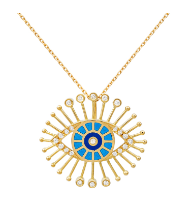 ومن علامة لاتلييه نوبر Latelier Nawbar، اخترنا لك سلسال ذهب أصفر مزين بأحجار الألماس الأبيض والإناميل الأزرق على شكل عين.