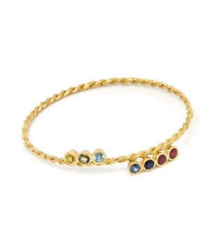 من علامة دونا حوراني Donna Hourani، اخترنا لك سوار ذهب أصفر مزين بأحجار الياقوت الملونة والروبي بأشكال عصرية.