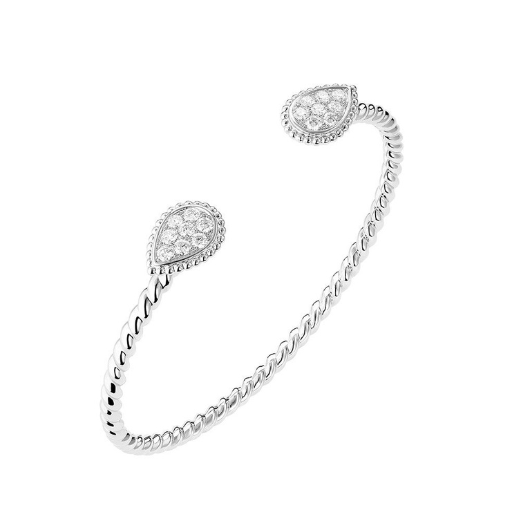 من علامة بوشرون نختار اسوارة من مجموعة Serpent Boheme بتصميم مفتوح رقيق وحالم من وحي الافعى رمز القوة الأنثوية في فخامة الذهب الأبيض والماس.