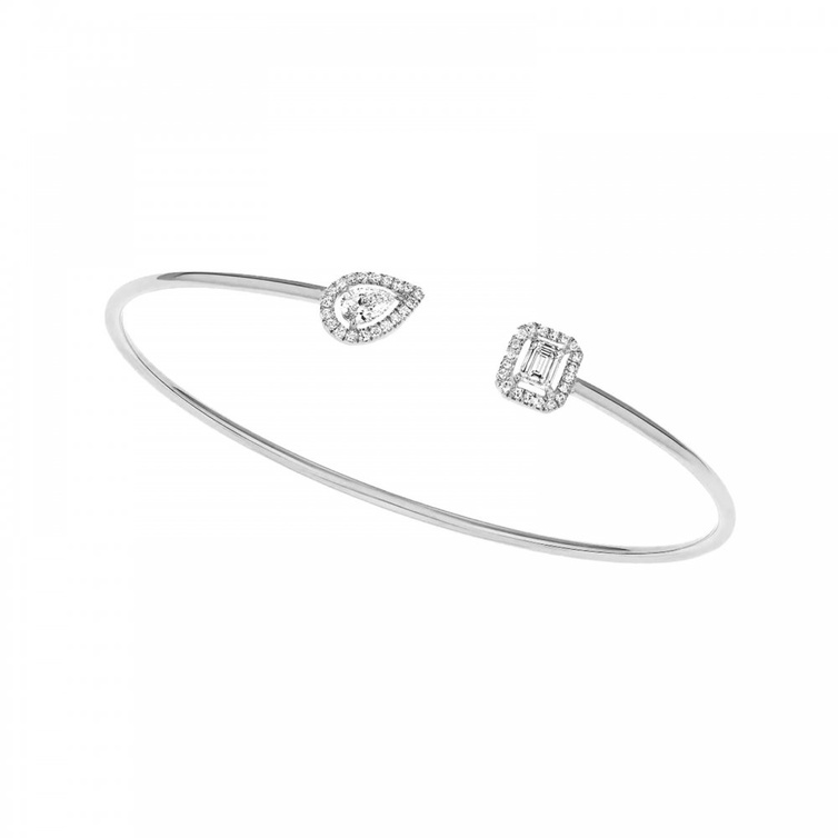 من علامة ميسيكا نختار اسوارة My Twin Toi & Moi بتصميم مفتوح ناعم مفعم بالعذوبة في سحر الذهب الأبيض وأناقة أحجار الماس بقصة الاجاصة والاميرالد.