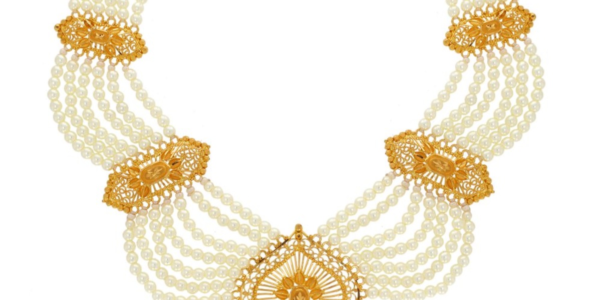 ومن الدار الهندية أيضاً اخترنا لكِ قلادة ذهبية مرصعة بفصوص الألماس واللؤلؤ الخلابة في تناغم ساحر رشيق.