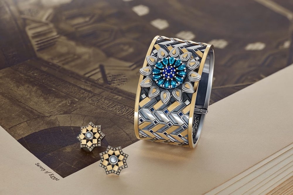 أسوارة عريضة cuff وزوج من الأقراط من مجموعة Mamluk من الألماس والياقوت الأزرق والتوباز واللؤلؤ والذهب الأصفر والفصة الإسترليني من العلامة عزة فهمي