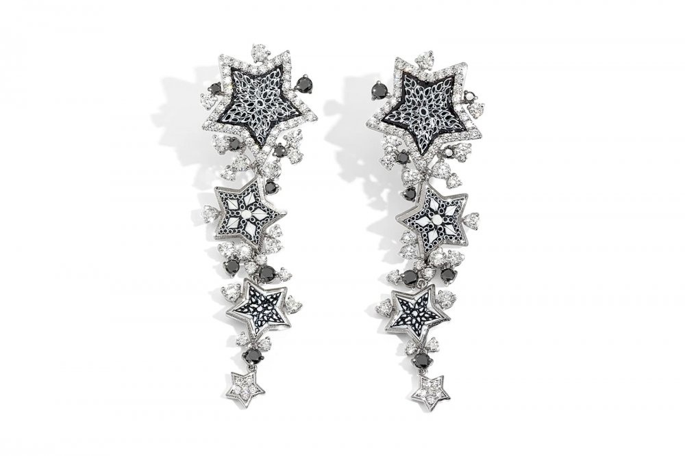 ومن المجموعة نفسها اخترنا لكِ أيضاً زوج من الأقراط الفاخرة مزين بالنجوم من الذهب الأبيض ومرصع بفصوص الألماس البراقة.