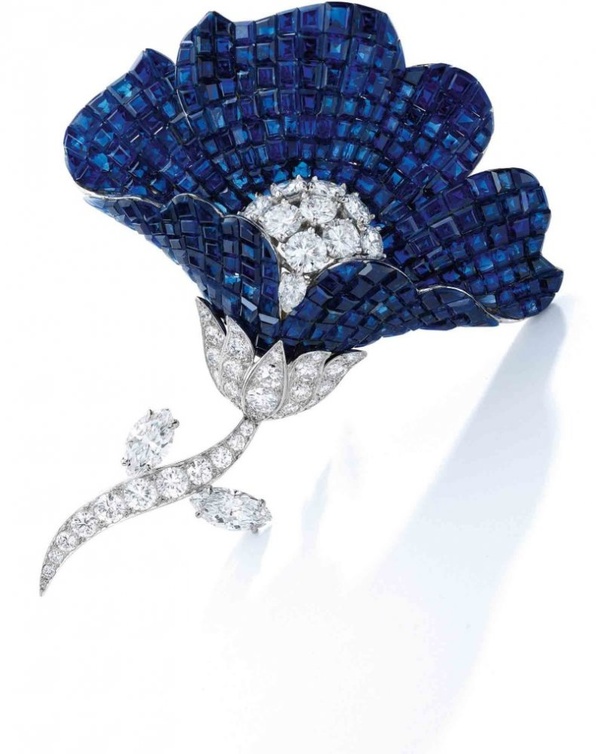 بيع بروش رائع صنع في عام 1965 من توقيع دار van cleef & arpels للمجوهرات الراقية، صُمم كزهرة مع بتلات الياقوت الأزرق المقطوعة بطريقة غامضة، والساق والأوراق مزينة بأحجار الألماس المستديرة والماركيزية، بسعر 1.109.00 دولار.