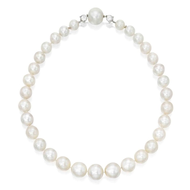 من الممتلكات الخاصة لسيدة المجتمع الأمريكية الراحلة ماريلو ويتني، بيع عقد ملكي مكون من 32 لؤلؤة طبيعية ومشبك محدد بماستين دائريتين بتركيبات زهور، بسعر 1.653.500 دولار.