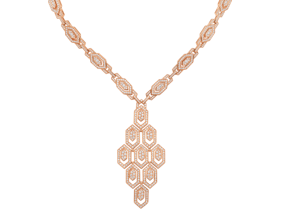 ومن الدار نفسها للرائس المحبات للذهب الملون، اخترنا لهن عقد SERPENTI من الذهب الوردي عيار 18 قيراطاً مرصع بماسات مرصوفة على السلسلة والقلادة في سحر ونعومة شديدة.