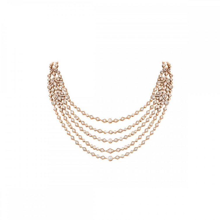 من مجموعة Albemarle لدار garrard العريقة للمجوهرات الراقية اخترنا لعروس هذا الشتاء، عقد خلاب متعدد الطبقات مصنوع من الذهب الوردي ومرصع في نعومة كبيرة بفصوص الألماس البراقة الساحرة، في تصميم يمنح صاحبته مزيداً من الأنوثة في ليلة عمرها.