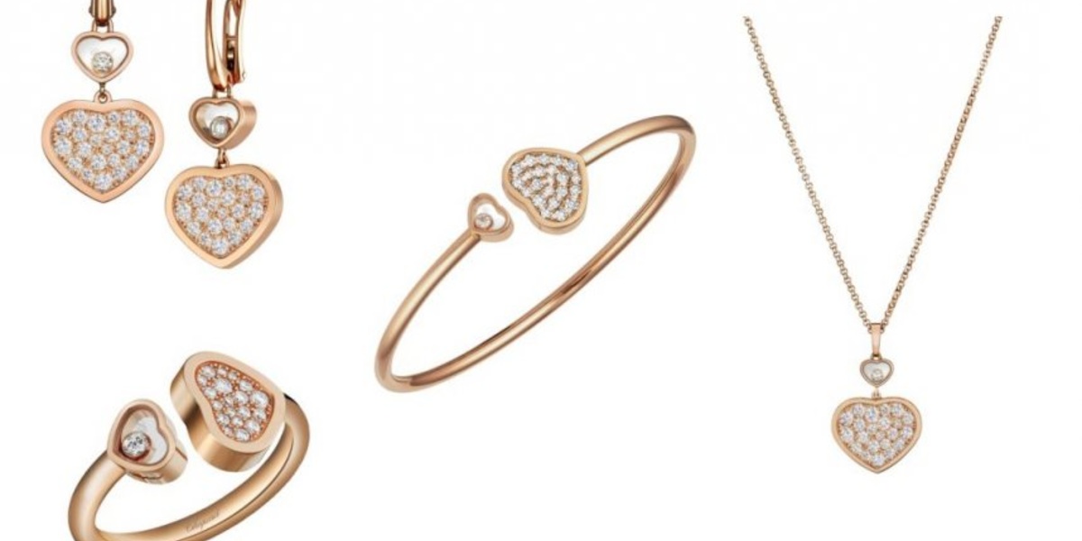 طقم مجوهرات ذهب وردي أنثوي وناعم من مجموعة Happy Hearts من علامة شوبارد Chopard، مكون من سلسال وأقراط وسوار وخاتم، مزين بأحجار الألماس بأشكال القلوب.