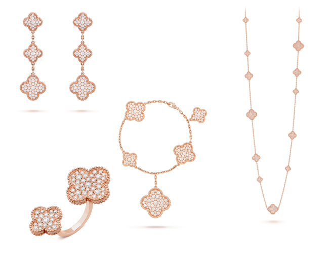 طقم مجوهرات ذهب وردي راقي من مجموعة Magic Alhambra من علامة فان كليف اند آربلز Van Cleef & Arpels، مكون من سلسال وأقراط وسوار وخاتم، مزين بأحجار الألماس الأبيض.