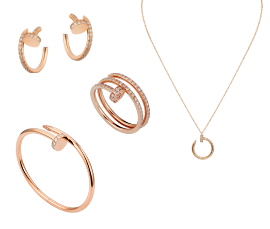 طقم مجوهرات ذهب وردي عصري ومرح من مجموعة Juste Un Clou من علامة كارتييه Cartier، مكون من سلسال وأقراط وسوار وخاتم، مع لمسة من أحجار الألماس الأبيض الصغيرة.