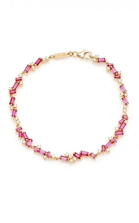 تقدم علامة سوزان كالان البهجة المشرقة التي تلفت الأنظار في الألعاب النارية وتعيد صياغتها في اسوارة مفعمة بالبريق من الذهب الأصفر والماس وأحجار الياقوت الوردي بقطع الباغيت.