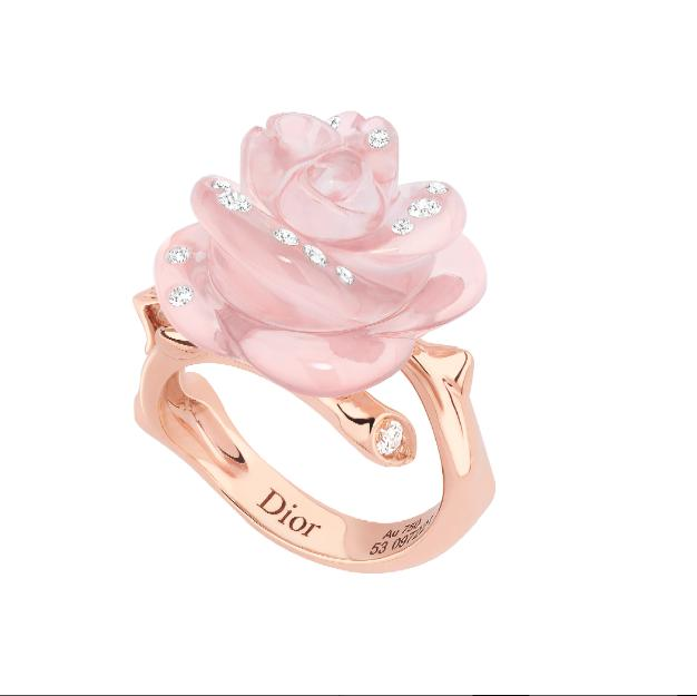 عبر مجموعة Rose Dior Pré Catelan قدمت علامة ديور الرومانسية الفاتنة للورود في تصميم خاتم شاعري من الذهب الوردي والماس والكوارتز الوردي المنحوت.