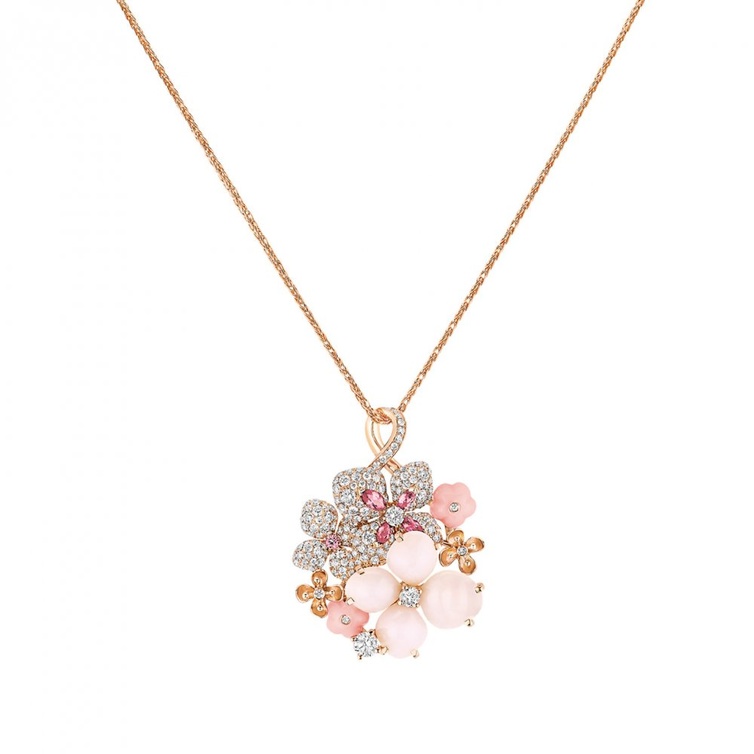 بعذوبة أنثوية لافتة وأناقة رومانسية تلائم عيد الحب قدمت علامة شوميه سلسلة Chaumet Hortensia بشكل باقة من الزهور الرقيقة تتألق بفخامة الذهب الوردي والماس والياقوت الوردي والأوبال الوردي.