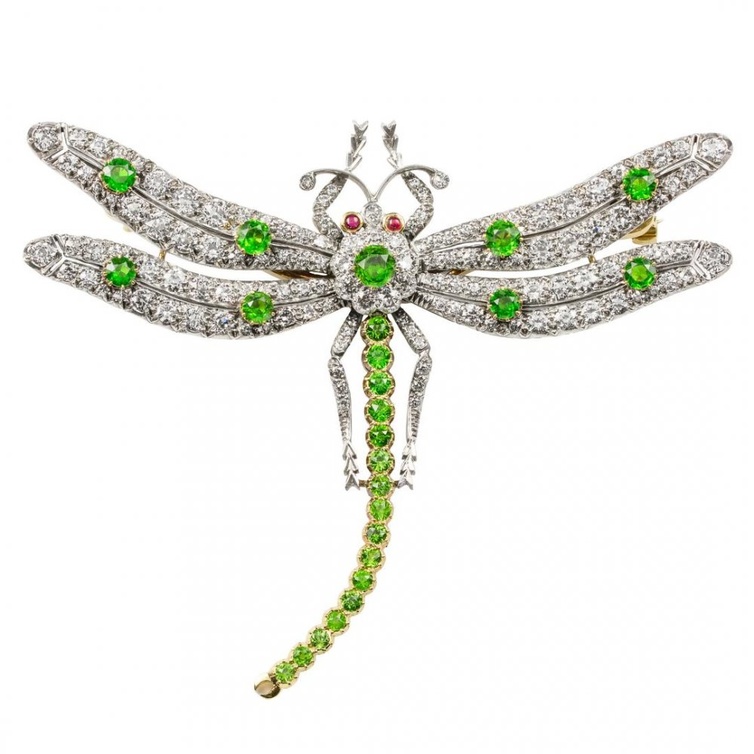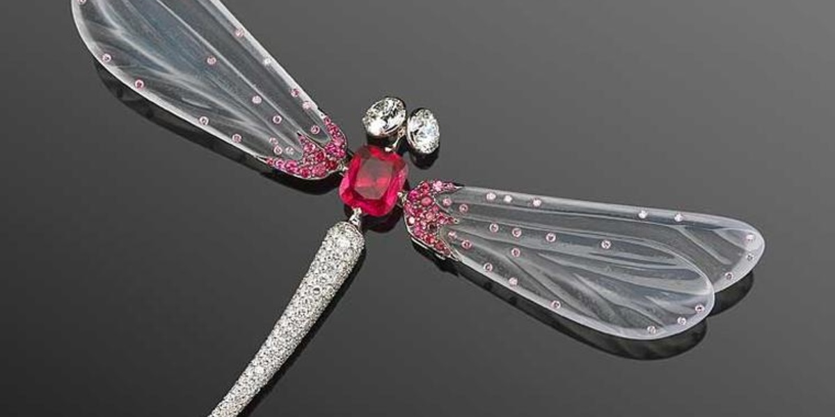 بروش اليعسوب الأبيض شبه الشفاف من فريد لايتن Fred Leighton، منحوت بدقة، حيث تمّ ترصيع الأجنحة بحجر السبينل الأحمر، المرتكزة على جسم من السبينل الأحمر وذيل من الألماس من الذهب الأبيض.