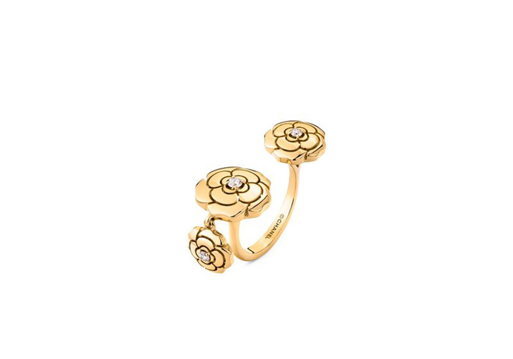 دلال أنثوي ساحر بعطر زهور الكاميليا تقدمه علامة شانيل في خاتم Extrait De Camélia المميز بتصميم مفتوح من زهور الكاميليا مع قطعة من الكاميليا تتدلى بأناقة من الذهب الأصفر والماس.
