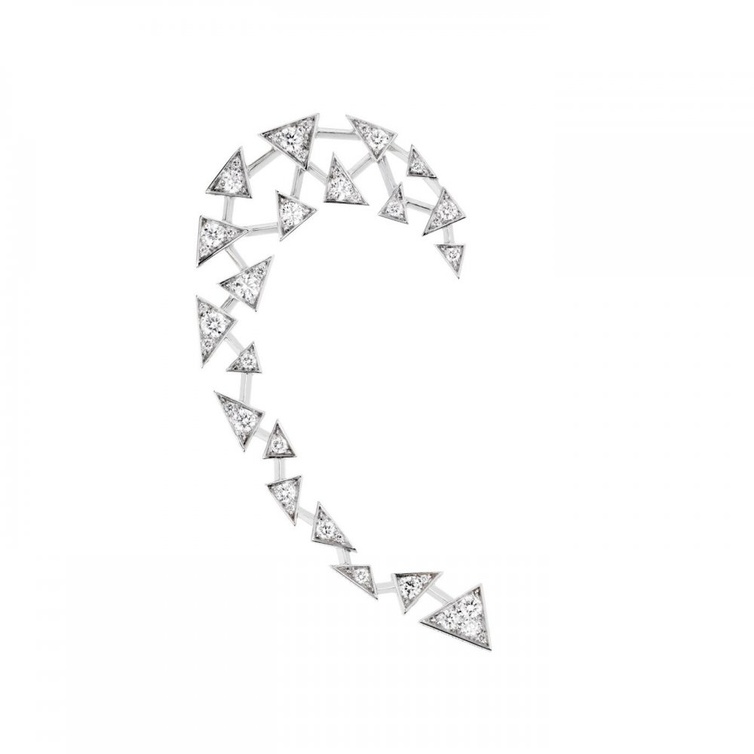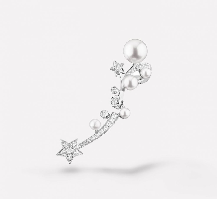 أقراط ذهب أبيض متسلقة أنثوية من مجموعة Comete Perlee من علامة شانيل CHANEL، مزين بأحجار الألماس الأبيض الصغيرة مع أحجار اللؤلؤ البارزة.