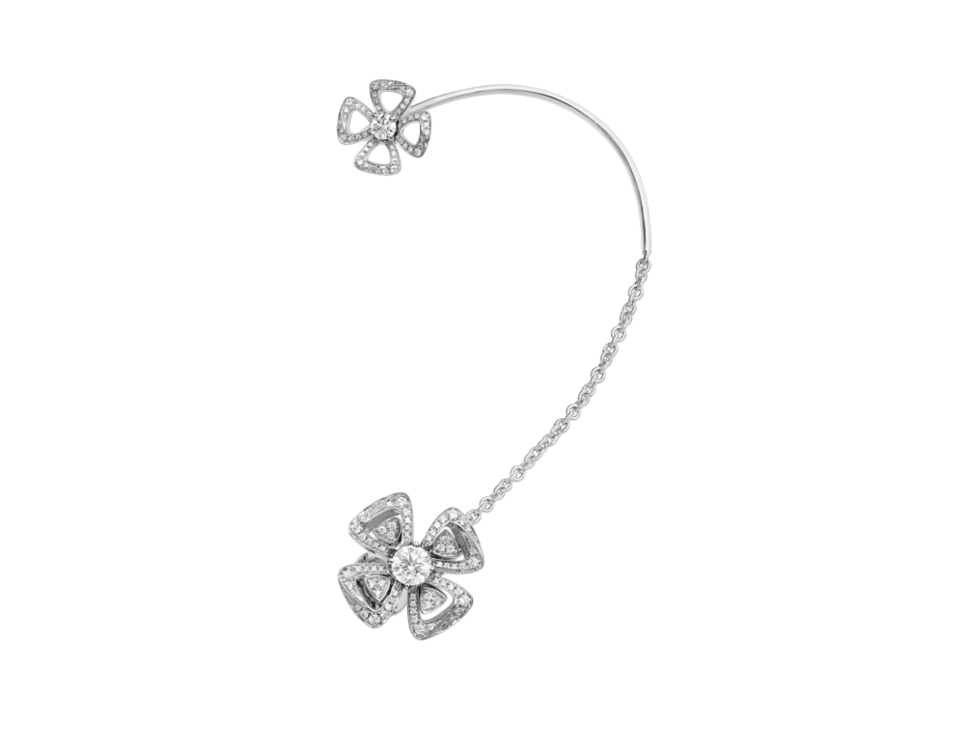 أقراط ذهب أبيض متسلقة أنثوية من مجموعة Fiorever من علامة بولغري Bvlgari، مزين بأحجار الألماس الأبيض الصغيرة بأشكال الزهور.