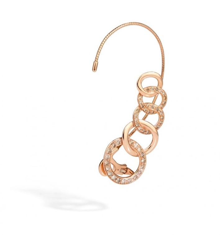 أقراط ذهب وردي متسلقة عصرية من مجموعة Brera من علامة بوميلاتو Pomellato، مزينة بأحجار الألماس البني الصغيرة من الأسفل.