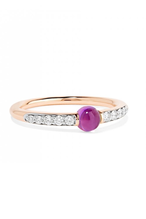 نعومة وعذوبة لافتة تزين أناملك مع هذا الخاتم الناعم من علامة بوميلاتو المفعم بسحر الذهب الوردي والماس مع حجر الجمشت.