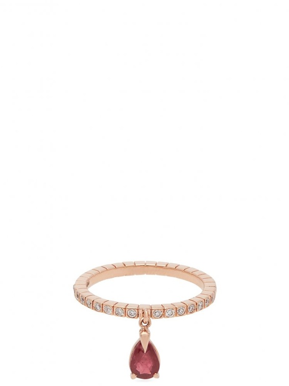 من علامة ديان كورداس يتألق هذا الخاتم المفعم بالعذوبة والرقة المرهفة في سحر الذهب الوردي والماس مع حجر متدلي من الياقوت الأحمر.