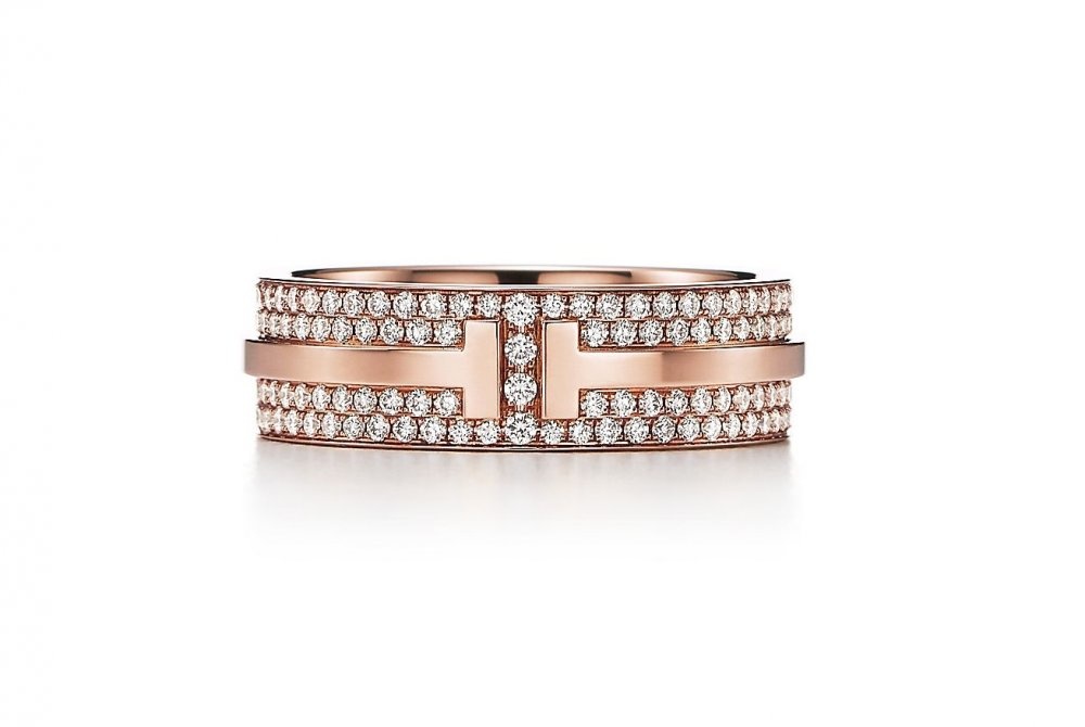 خاتم ذهب وردي عريض أنثوي من مجموعة Tiffany T من علامة تيفاني اند كو Tiffany & Co، مزين بأحجار الألماس الأبيض الدائرية الصغيرة.