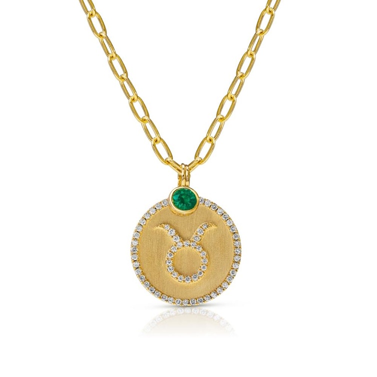 من آن سيسترسون Anne Sisteron، ميدالية تُمثّل برج الثور من الذهب الأصفر حفر عليها رمز البرج ورصّع بالألماس وحجر الزمّرد الأخضر.