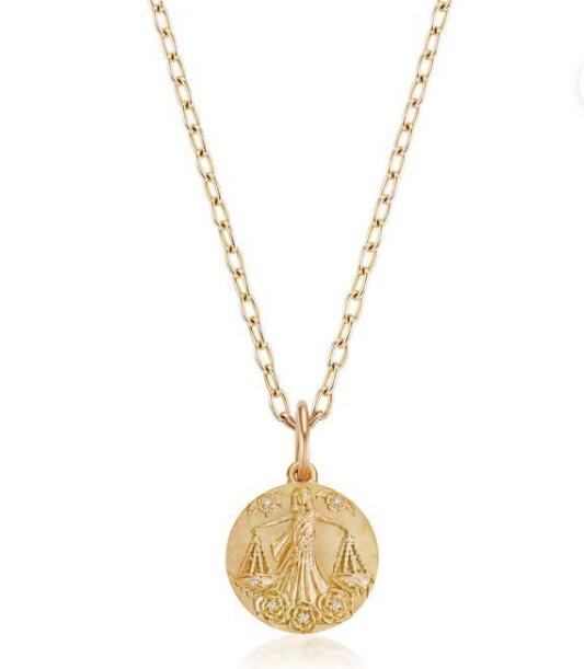 نسخة مُصغرّة من ميدالية Zodiac من بريوني رايموند Briony Raymond، تتميز الميدالية القابلة للتخصيص بعلامة برج الميزان المصنوعة من الذهب والمزينة بأحجار الماس اللامعة المستديرة أو أحجار الميلاد بحسب إختيارك.