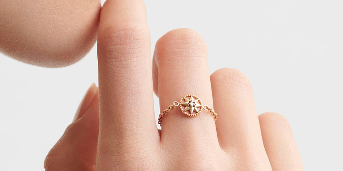 في مجموعة Rose De Vents قدمت علامة ديور هذا الخاتم الأنيق بتصميم السلسلة مع تميمة من وحي بوصلة الرياح بأناقة الذهب الأصفر والماس مع الفيروز.
