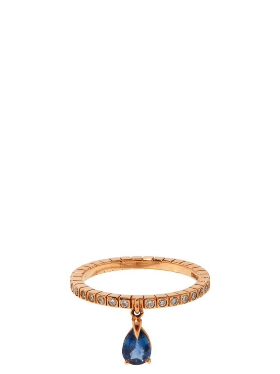 ابتكرت علامة ديان كورداس هذا الخاتم المفعم بالعذوبة الأنثوية والرقة المرهفة بتألق الذهب الوردي والماس مع حجر متدلي من الياقوت الأزرق.
