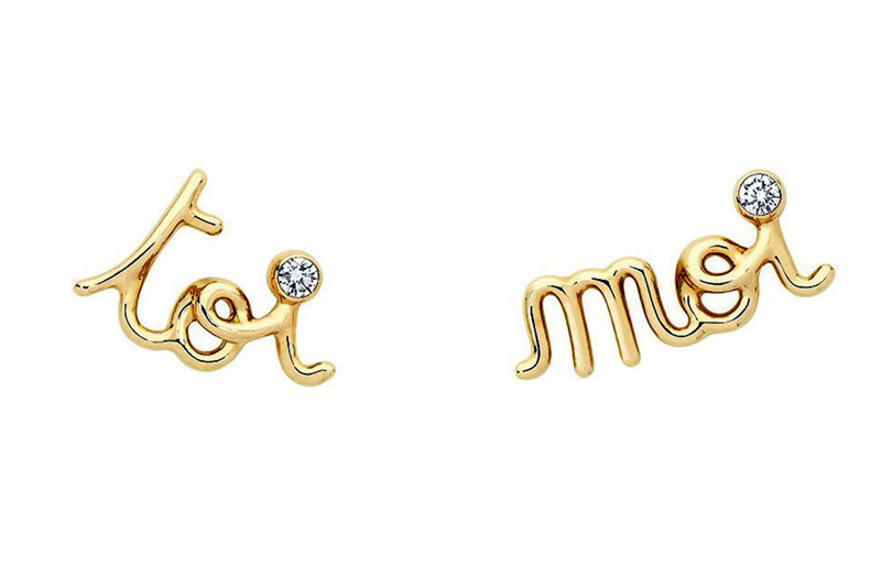 قدمت علامة ديور أقراط طريفة بتصميم كلمات Toi, Moi في شكل الكتابة اليدوية في بريق ناعم من الذهب الأصفر المرصع بالماس.