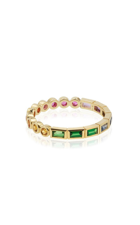 تصميم جذاب ومشرق في خاتم من علامة ايفون ليون يتألق بلمسة لونية رقيقة في تألق الذهب الاصفر وأحجار الياقوت الملونة.