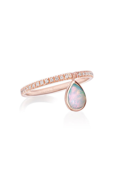 رقة وعذوبة لافتة تزين أناملك مع هذا الخاتم الجذاب من علامة نينا رانزدورف مفعم بنعومة ساحرة من الذهب الوردي المرصع بالماس وحجر الاوبال بقصة الاجاصة.