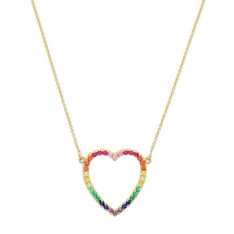 قدمت علامة جينيفر ماير هذه السلسلة بتصميم مبهج ولافت بالمرح في شكل القلب من الذهب الأصفر المرصع بأحجار الياقوت الملونة بألوان قوس قزح.