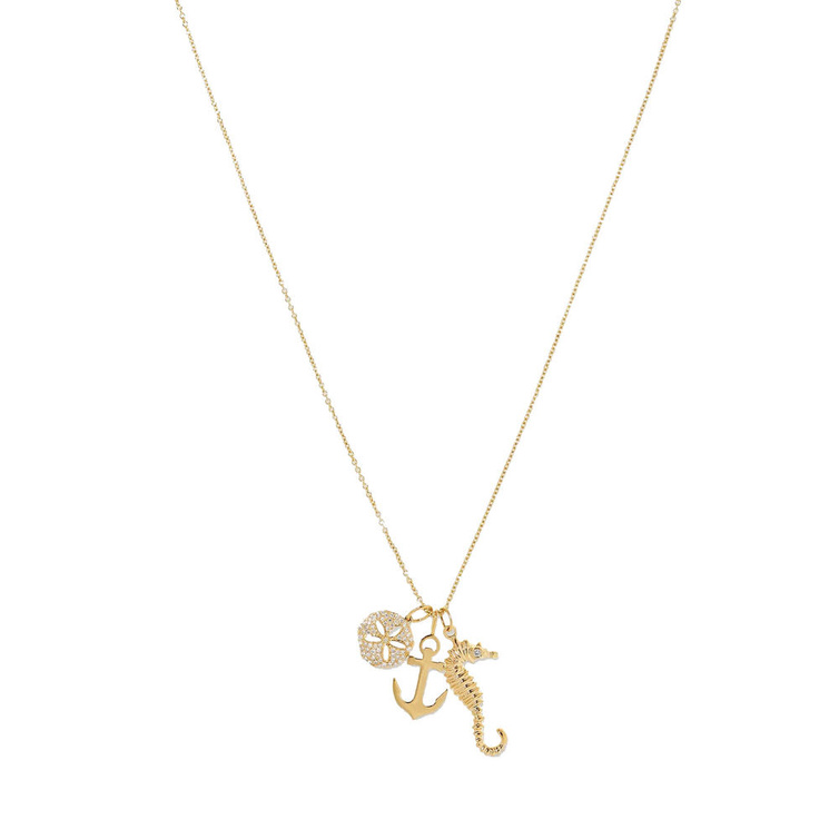 تصميم جذاب ومرح يتألق في سلسلة لافتة من علامة سيدني ايفان بشكل فرس البحر ومرساة السفينة لتضفي روح شبابية على الاطلالة بفخامة الذهب الأصفر والماس.