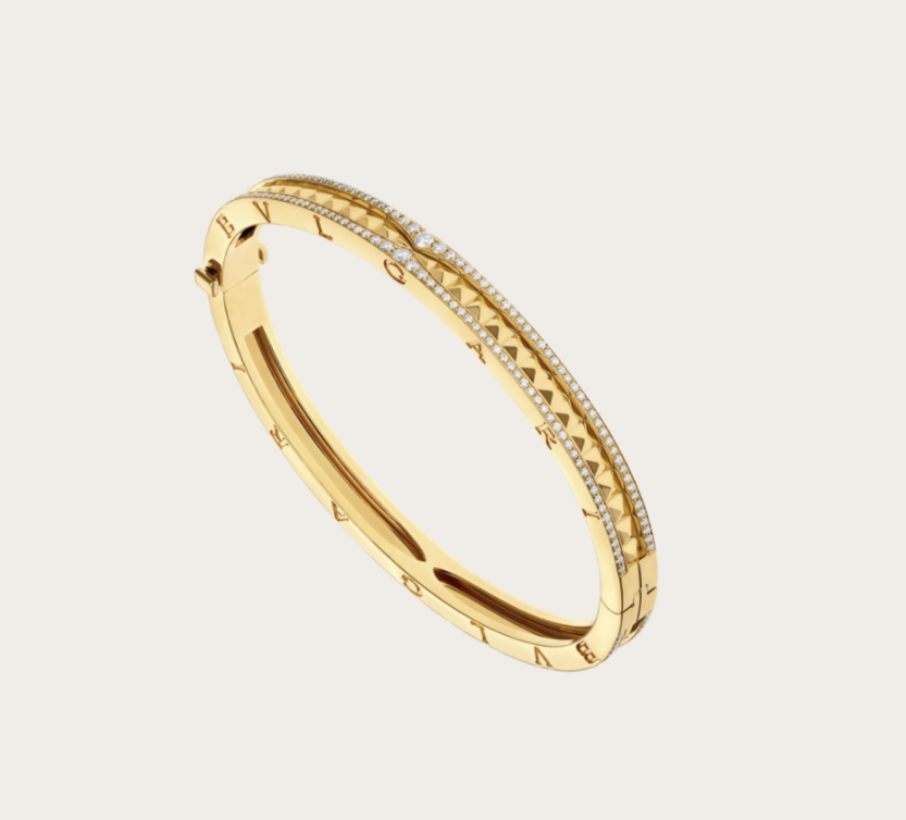سوار بولغاري Bvlgari من مجموعة B.zero1 مصمم من الذهب الأصفر ومرصع بالألماس المرصوف على جانبي السوار. استقى السوار إلهامه من أشهر مسارح العالم الكولوسيوم، فحلقاته اللولبية المتميزة قد تم إعادة تصوّرها بزخارف نافرة من الذهب تبرز الرؤيا العفوية الجريئة لتصميم بولغري الأيقوني.