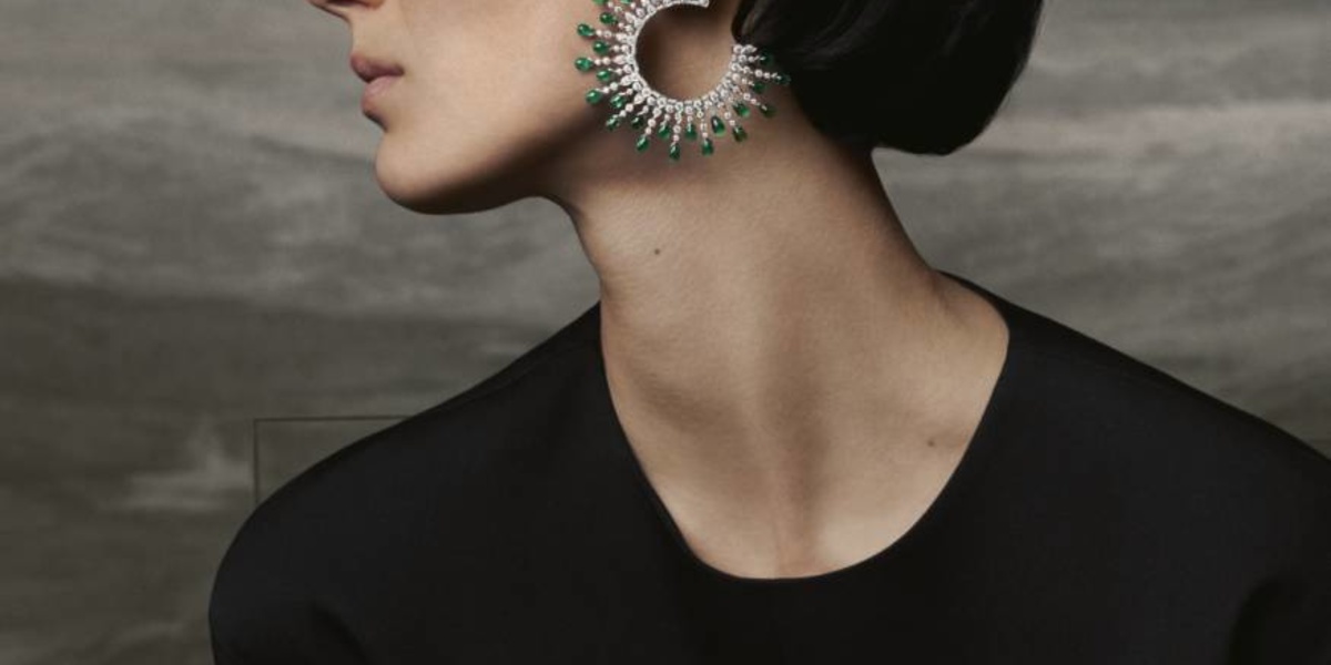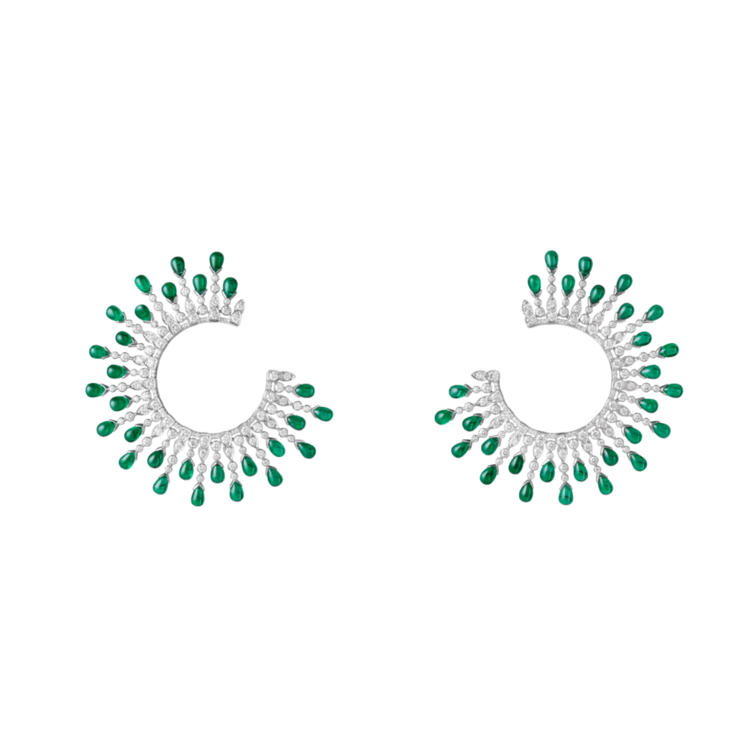 أقراط New Maharajah من بوشرون Boucheron مصنوع من البلاتين والزمرّد والألماس. وزُيّن هذان القرطان بنقش مشعّ ورُصّعا بماسات تنتهي أطرافها بـ 58 قطرة من الزمرّد بلون أخضر يأسر الألباب. تمنحك هذه الأقراط من بوشرون Boucheron إطلالة فخمة وراقية في رمضان تناسب جميع إطلالاتك.