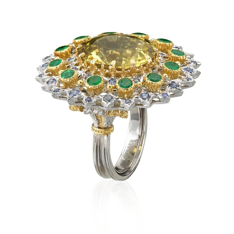 خاتم كوكتيل من بوتشيلاتي Buccellati من الذهب الأبيض والأصفر مع تورمالين كهرماني تحيط به أحجار الزمرد والياقوت الأزرق. التورمالين هو أندر الأحجار الكريمة المبهرة مثل قوس قزح لتعدد ألوانه المذهل. في ظلاله الصفراء على وجه الخصوص، فإن التورمالين والزمرد يمنحان المرأة طاقة إيجابية وإطلالة فخمة وراقية.