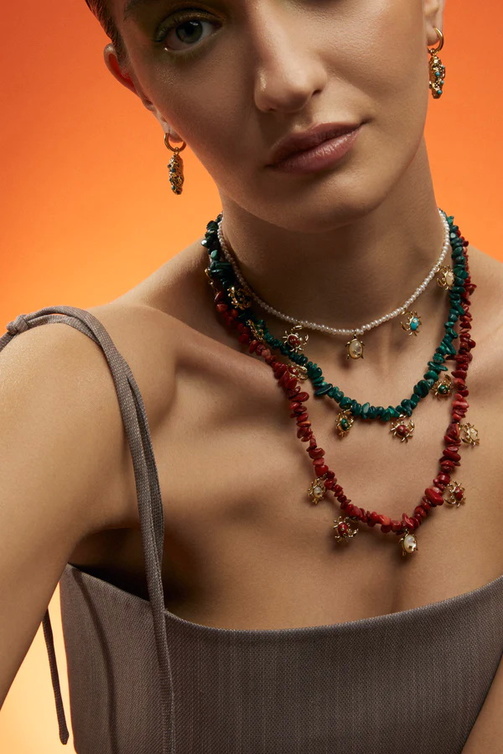 عقد حيوانات البحر، مرصّع بالملكيت وخمس حليات بألوان متناسقة. يمكن تعديلها حسب خط العنق السفلي.