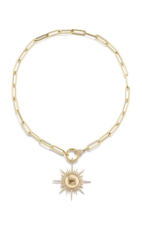 ومن موديلات سلاسل الجنزير نختار لك سلسلة Il Sole من سوريلينا Sorellina بتصميم جذاب لحلقات السلاسل الواسعة مع تعليقة بشكل الشمس من الذهب الأصفر والماس.