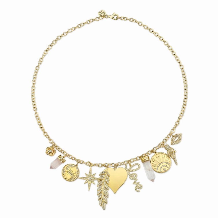 ومن موديلات سلاسل charms نختار لك سلسلة LUCKY IN LOVE MULTI-CHARM من سيدني ايفان Sydney Evan المشرقة بتصميم من الذهب الأصفر والماس وأحجار كريستال الكوارتز مع قطع متدلية بأشكال الورود والنجوم والشفاه والطائر والريشة وغيرها.