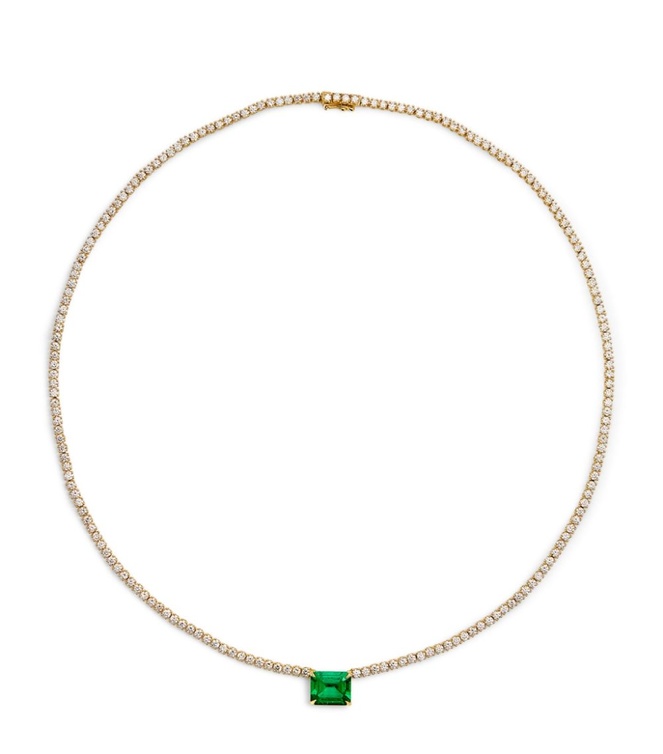 ومن موديلات عقود تشوكر الراقية المثالية لهذا الموسم نختار لك عقد Hepburn من أنيتا كو Anita Ko المميز بتصميم عقد تنس من الذهب الأصفر المرصع بأحجار الماس مع حجر جذاب من الزمرد.