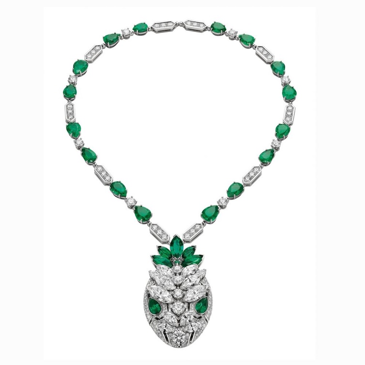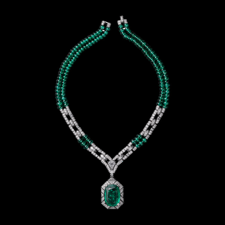 تبرز علامة كارتييه Cartier لمساتها في مجال الفخامة عبر قلادة Viracocha بتصميمها الملكي الأنيق متمتعة بحجر زمرد يزن 27 قيراط بقصة الوسادة تحيط به أحجار الماس وخرز الزمرد في تصميم بديع من الذهب الأبيض.