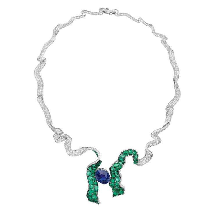 تبدو لمسة الهوت كوتور الفرنسية الخاصة بعلامة ديور Diorواضحة في هذه قلادة Dénoué من الذهب الأبيض والزمرد حيث اختارت شرائط الأقمشة بحركتها الانسيابية لتكون محور التصميم.